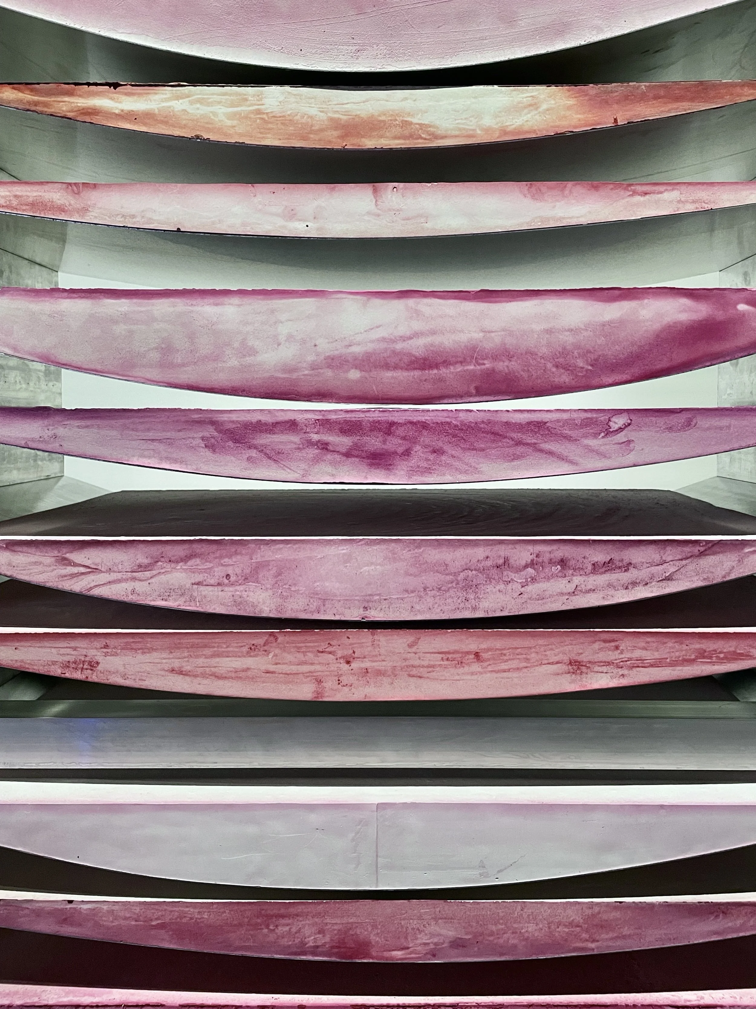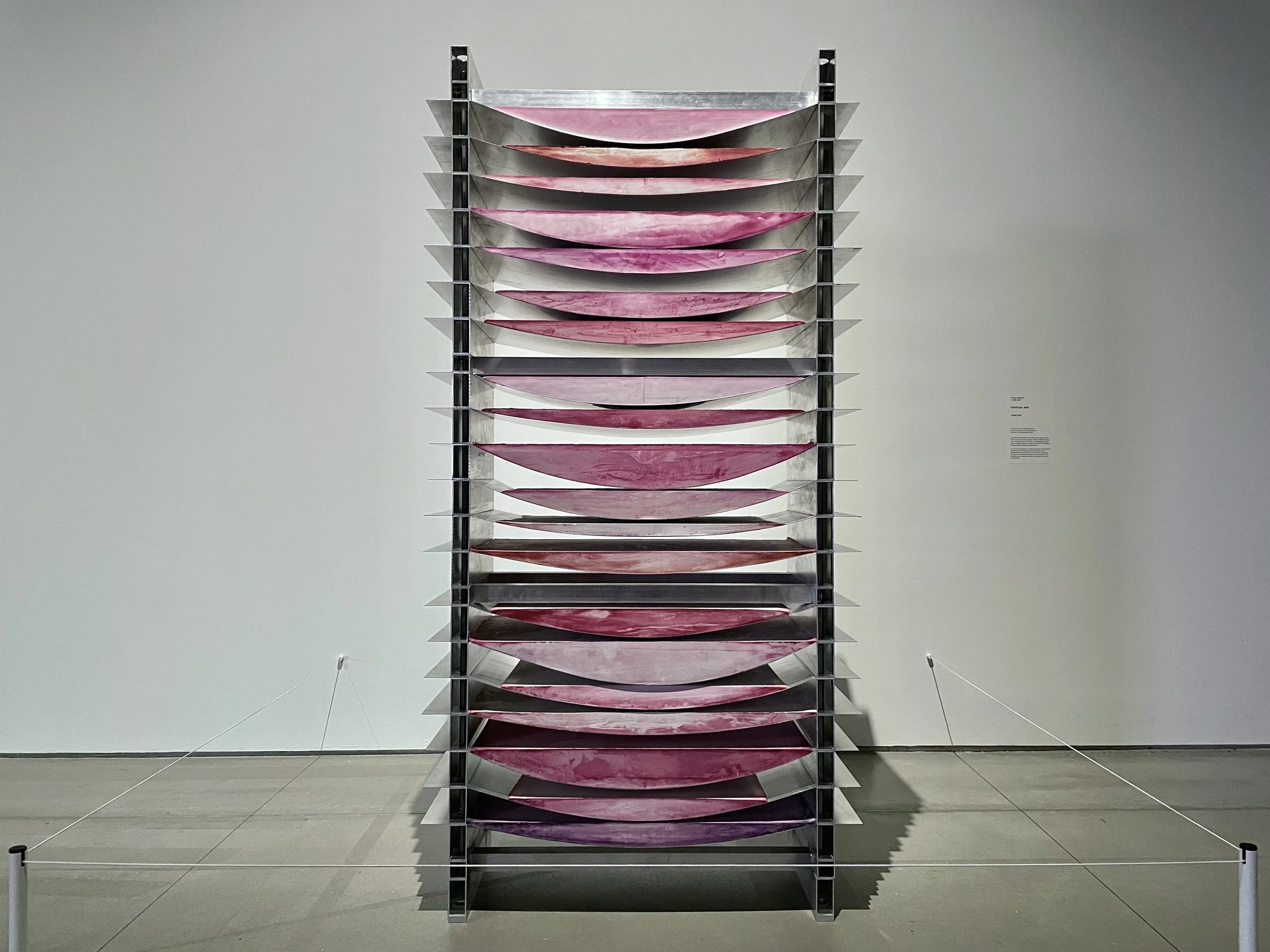 Tove Storch, Untitled, 2020. From far away it feels industrial. Up close, not really. The plaster surfaces bloom and streak in pink and violet between stacked aluminum plates.